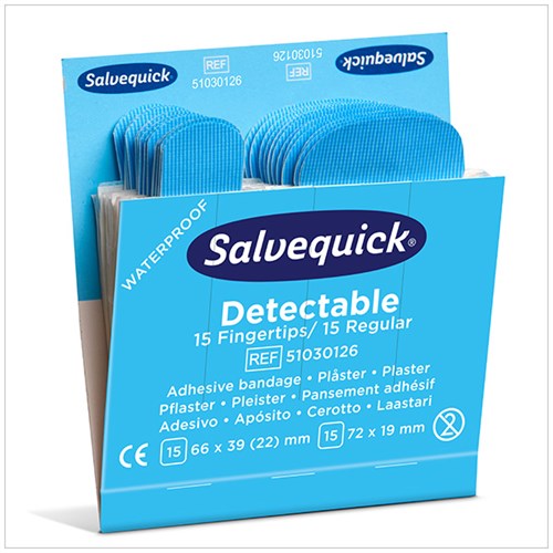 Salvequick Blue Detectable plaster er spesielt beregnet for bruk i næringsmiddelindustrien.