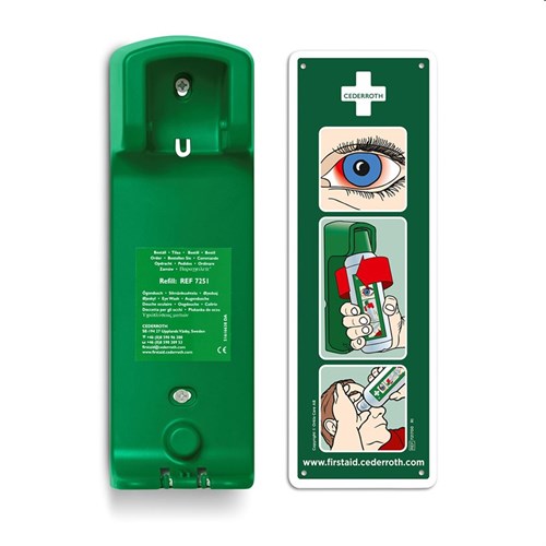 Robust og praktisk veggholder til Cederroth øyeskylleflaske 500 ml (produktnr. 215022). Med veggholderen får flasken en bestemt plass slik at alle vet hvor den finnes. Flasken sitter fast i veggholderen og åpnes automatisk når den vris ut av holderen – øyeskyllingen kan starte øyeblikkelig. Kan plasseres på mange forskjellige måter, og passer derfor på alle arbeidsplasser og i alle lokaler. Etterlysende instruksjonsskilt medfølger.