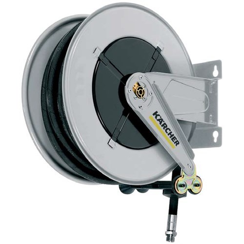 Lakkert stål høytrykk slangetrommel med svivel og 30 mtr slange.